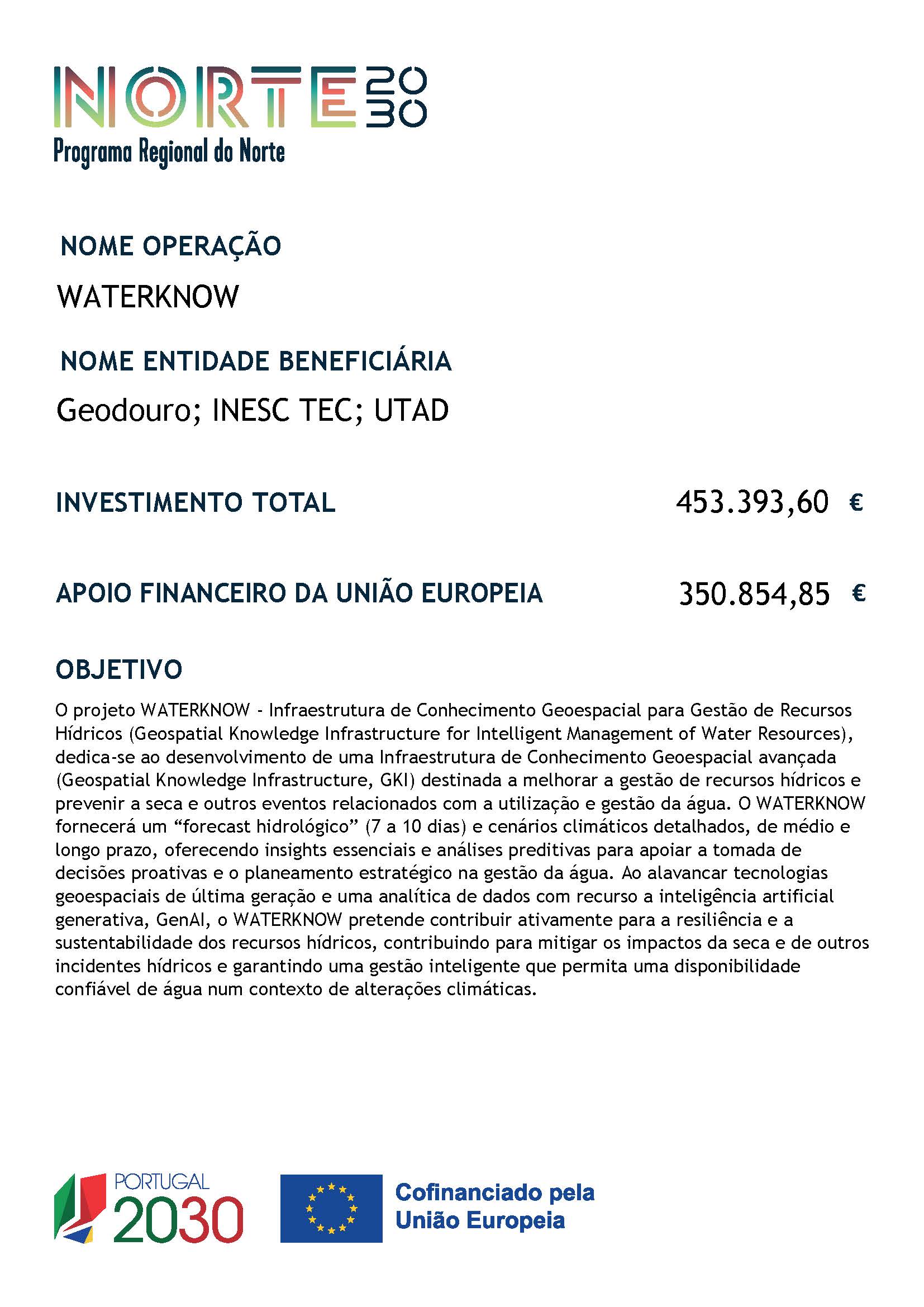 By leveraging state-of-the-art geospatial technologies and data analytics powered by generative artificial intelligence (GenAI), WATERKNOW aims to play an active role in enhancing the resilience and sustainability of water resources, helping to mitigate the impacts of drought and other water-related incidents, and ensuring smart management that guarantees a reliable water supply in the context of climate change.